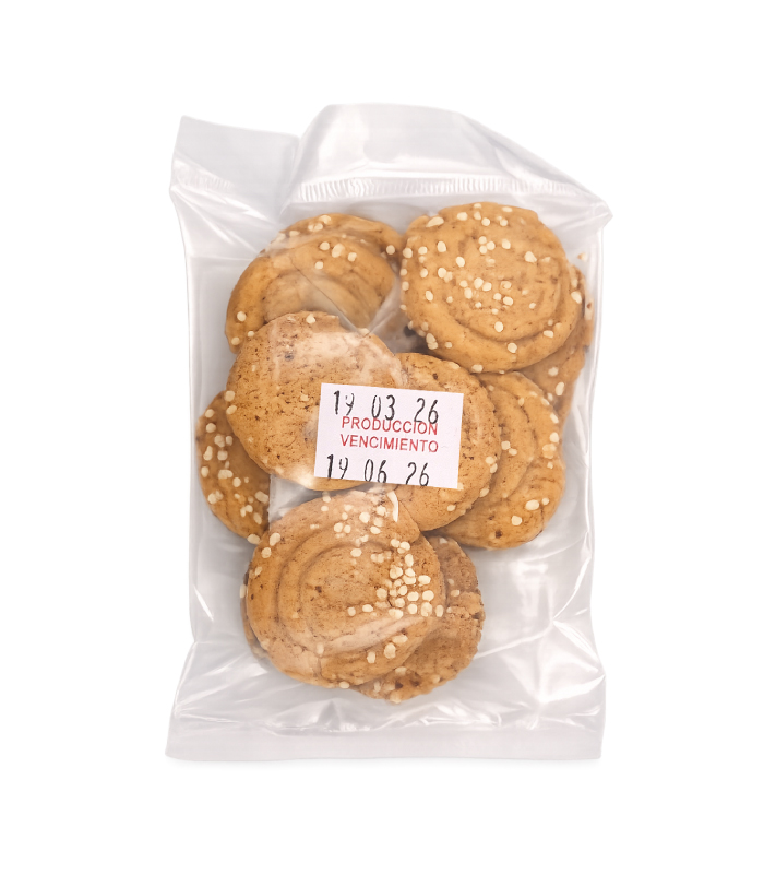 Galletas de 75 g elaboradas con harina integral de trigo fortificada y harina de kiwicha, combinadas con salvado de trigo y cañihua. Incluyen manteca vegetal, almendras, pasas, maní y ajonjolí, además de sal marina y polvo de hornear, aportando energía, fibra y nutrientes esenciales.